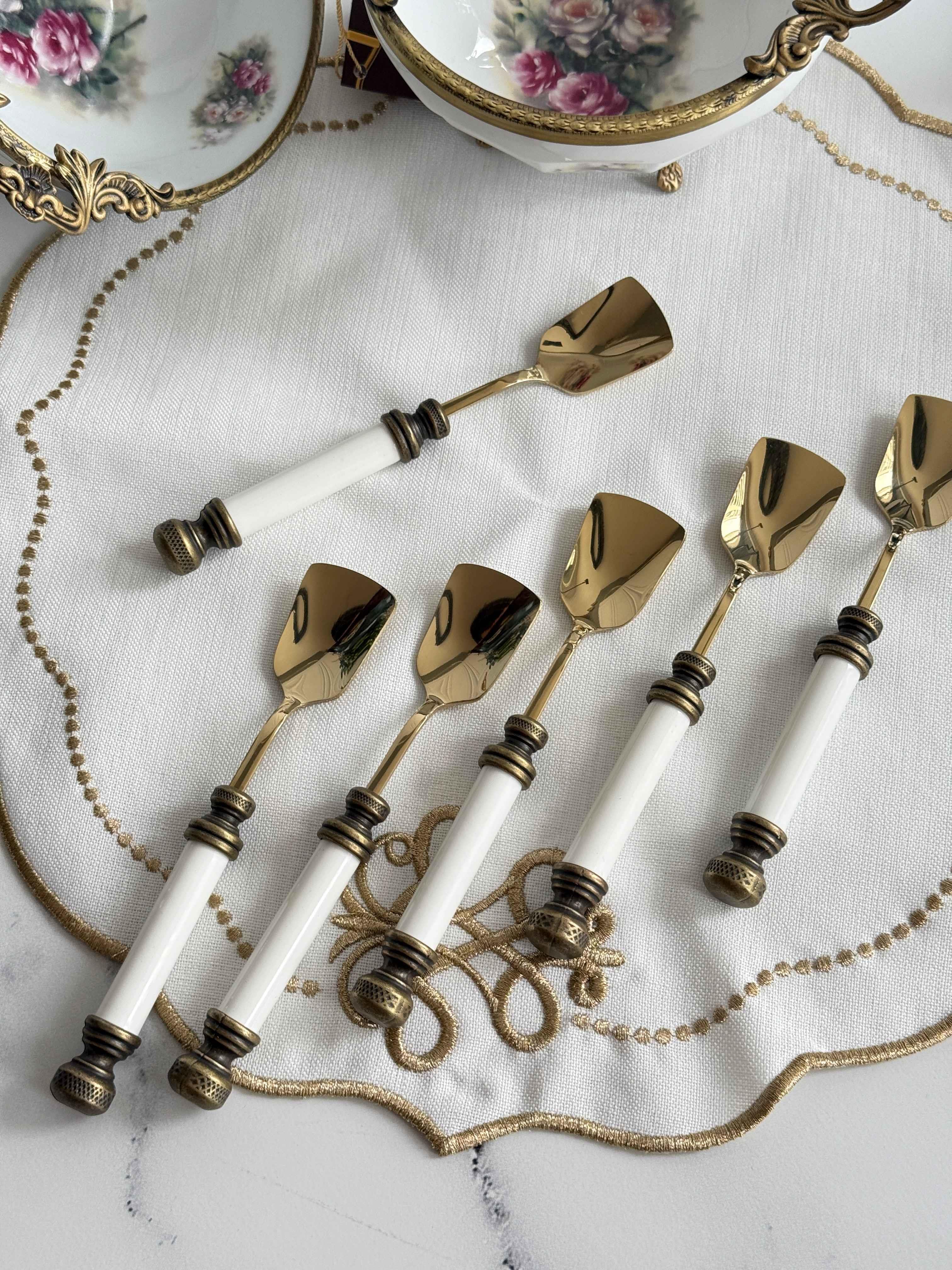 Antique Mat Gold Dondurma Kaşık 6'LıKlasik şıklığın modern yorumuyla tasarlanan Antiq Eskitme Gold Dondurma Kaşık Seti, eskitme görünümlü mat gold ağız kısmı ve zarif beyaz sap detayıyla sofralarınıza sofistike bir dokunuş katar. Tatlı ve dondurma sunumlarınızda stilinizi yansıtın.