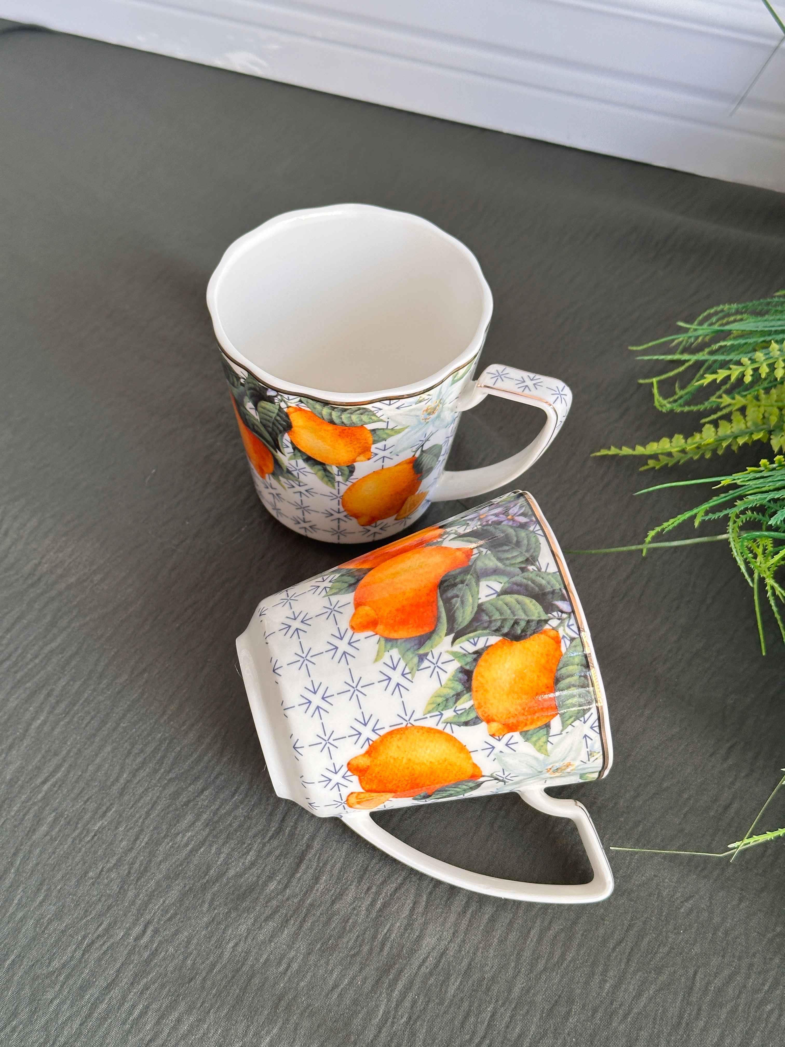 Set İçeriği: 2 adet kupaHacim: Her biri 350 mlMalzeme: Dayanıklı porselenDesen: Renkli limon ve yaprak baskılı özel tasarımKullanım: Sıcak & soğuk içecekler için uygundur
