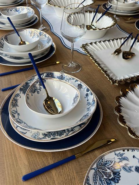 Gold detaylı orta sunumlar ve çatal kaşık takımı sadece elde yıkamaya uygundur.Rossev markasının kalitesi ve estetiğiyle tasarlanmış Marenza yemek takımı, özel davetlerinizden günlük kullanımınıza kadar her anınızı güzelleştirecek.