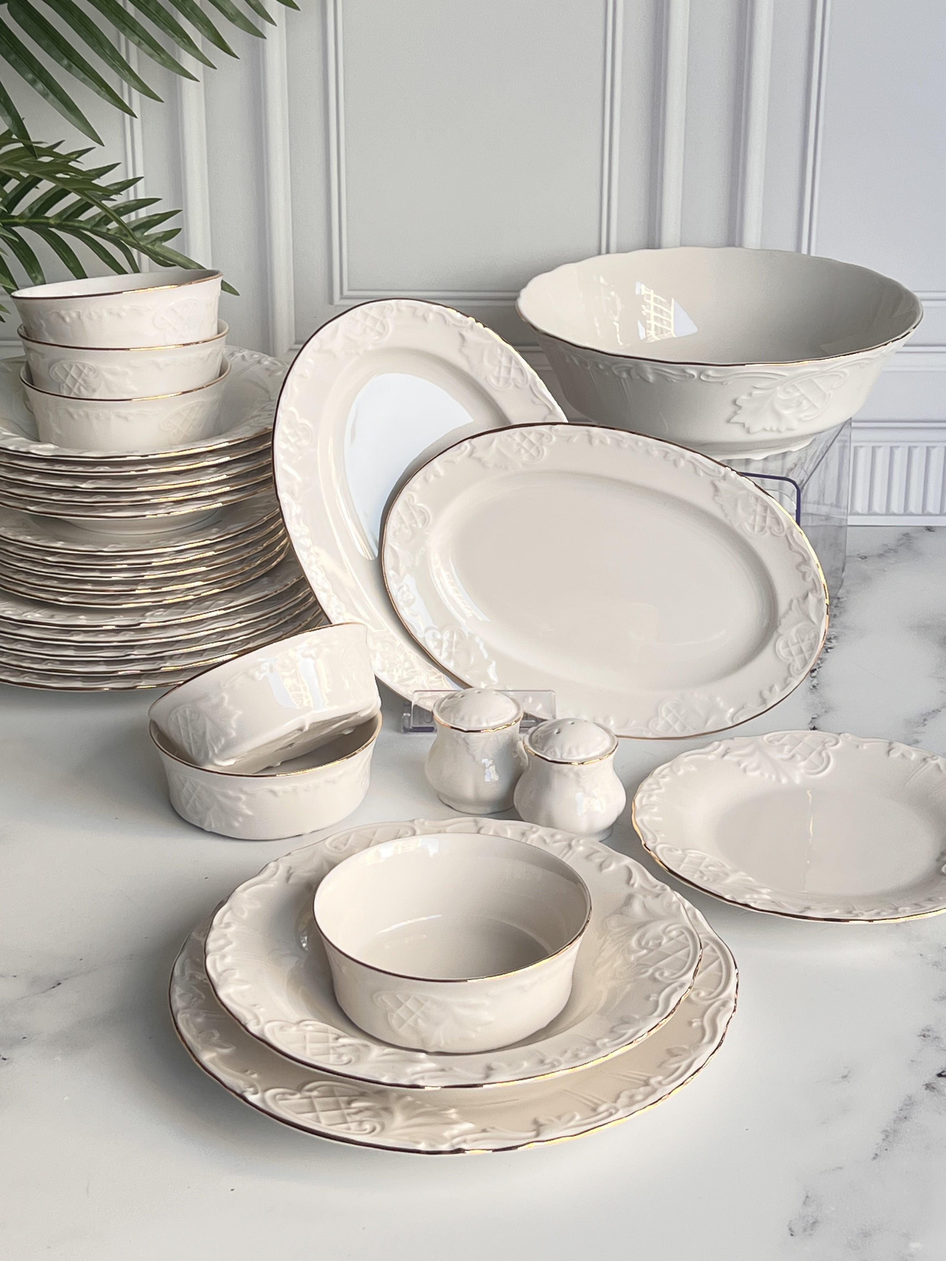 İris Gold Yemek Takımı 28 Parça 6 KişilikZarif kabartma desenleri ve altın yaldızlı kenar detaylarıyla tasarlanan Iris 29 Parça Porselen Yemek Takımı, klasik şıklığı modern dokunuşlarla buluşturuyor. Krem rengi zemin üzerindeki ince işçilik, sofralarınıza estetik ve zarafet katarken, yüksek kaliteli porselen malzemesi sayesinde uzun ömürlü ve dayanıklı bir kullanım sunar.