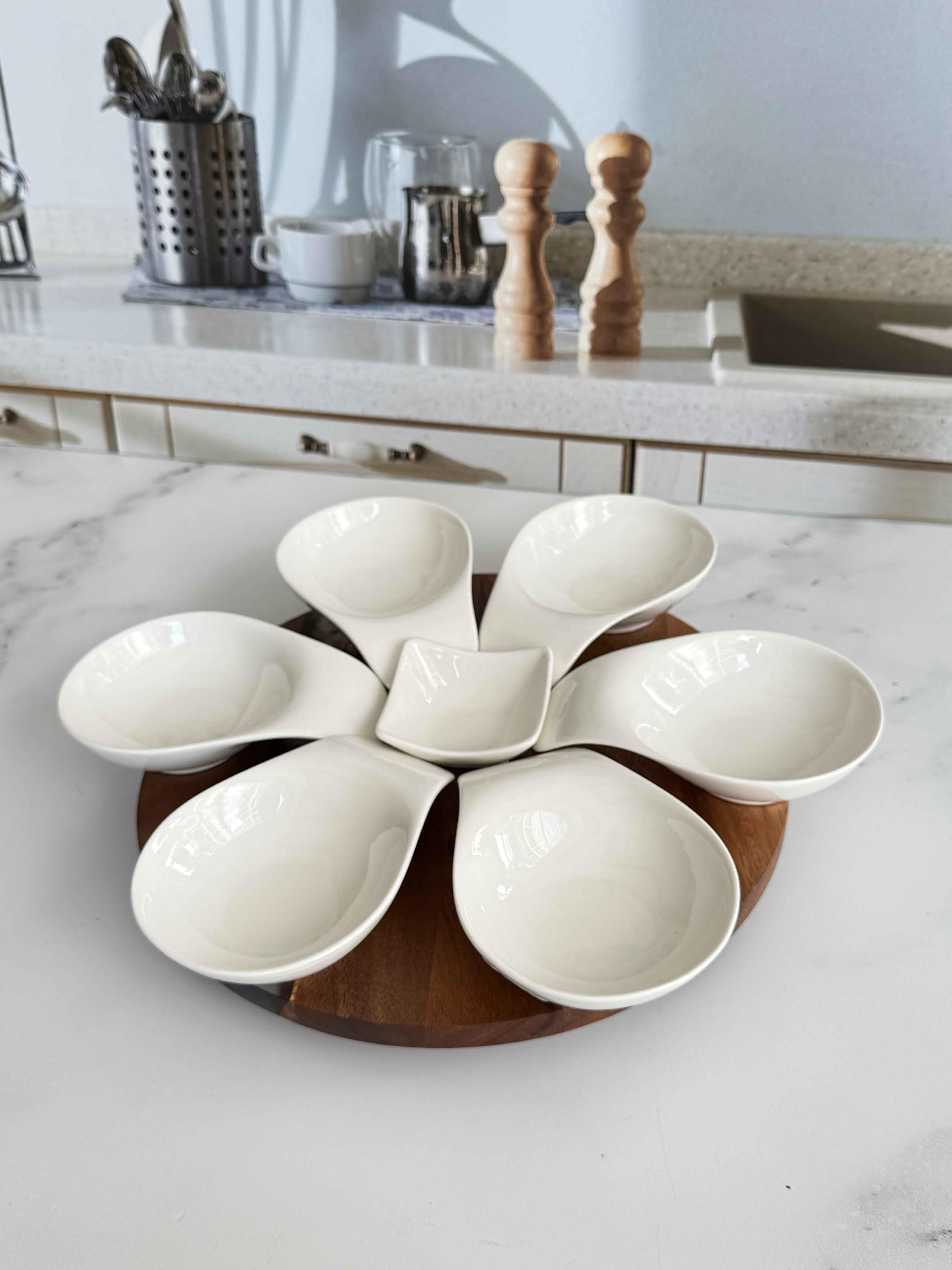 Doğal akasya ağacından üretilmiş döner taban üzerine yerleştirilen 6 adet kulplu porselen kase ve 1 adet kare porselen sunumluk ile bu set, sofralarınıza zarafet ve kullanım kolaylığı kazandırıyor. Sunumlarınızı bir üst seviyeye taşıyacak bu ürün, aynı zamanda hem günlük hem de özel gün kullanımları için idealdir.