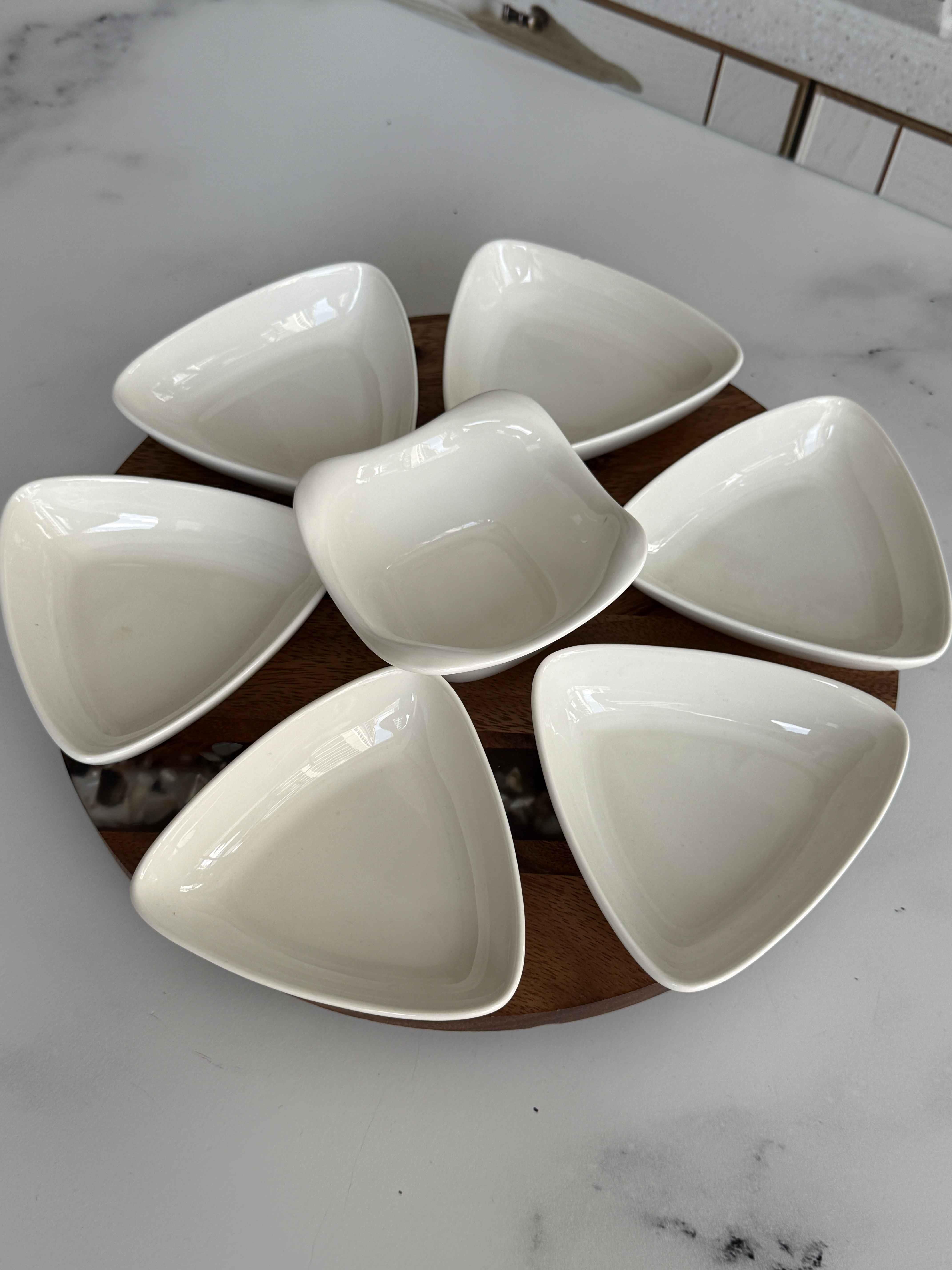 Doğal akasya ağacından üretilmiş döner taban üzerine yerleştirilen 6 adet üçgen porselen kase ve 1 adet kare porselen sunumluk ile bu set, sofralarınıza zarafet ve kullanım kolaylığı kazandırıyor. Sunumlarınızı bir üst seviyeye taşıyacak bu ürün, aynı zamanda hem günlük hem de özel gün kullanımları için idealdir.