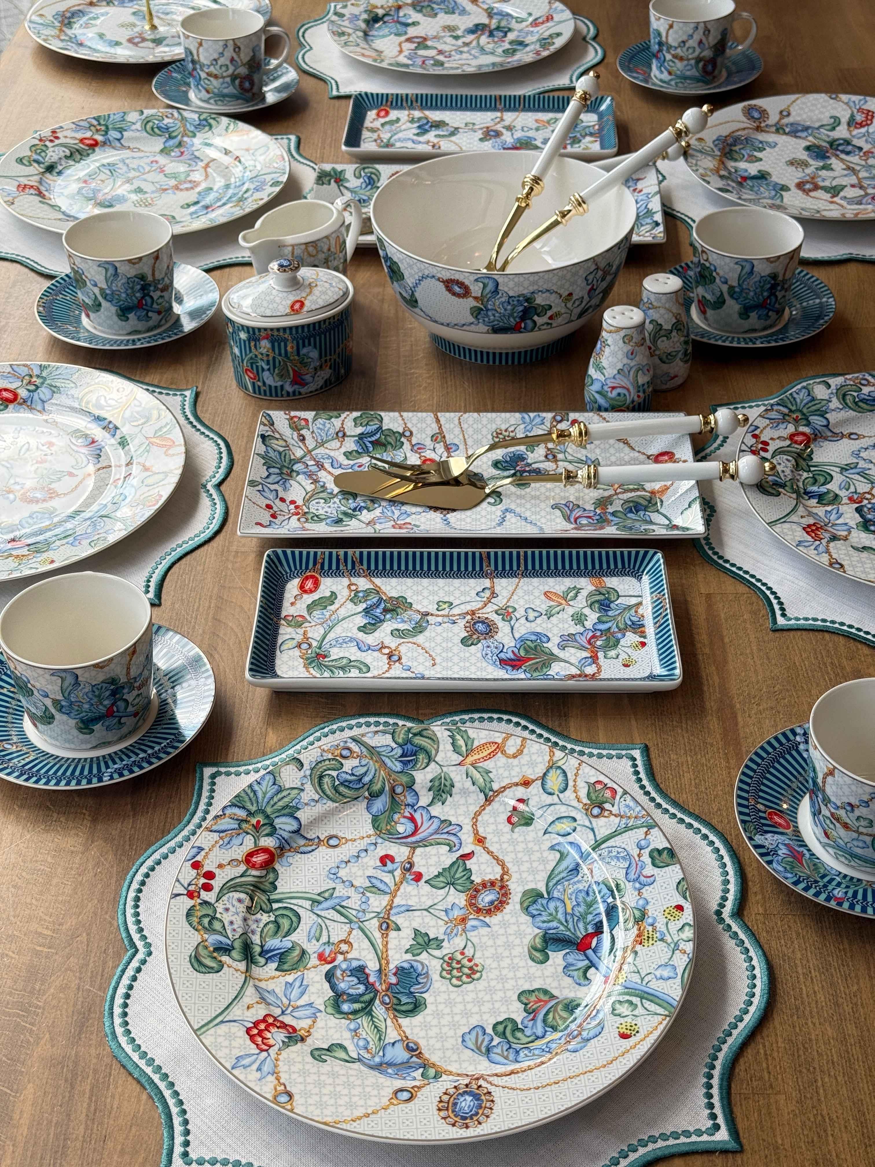 Sofralarınıza zarif bir dokunuş katacak, fonksiyonellik ve estetiği buluşturan Azur 39 parçalık kahvaltı takımı ile kahvaltılarınız artık çok daha keyifli ve şık. Porselenin zarafeti, mavi-turkuaz çizgi detayları ve canlı çiçek motiflerinin uyumuyla hazırlanan bu set, günlük kullanımdan özel davetlere kadar her anınıza eşlik edecek.