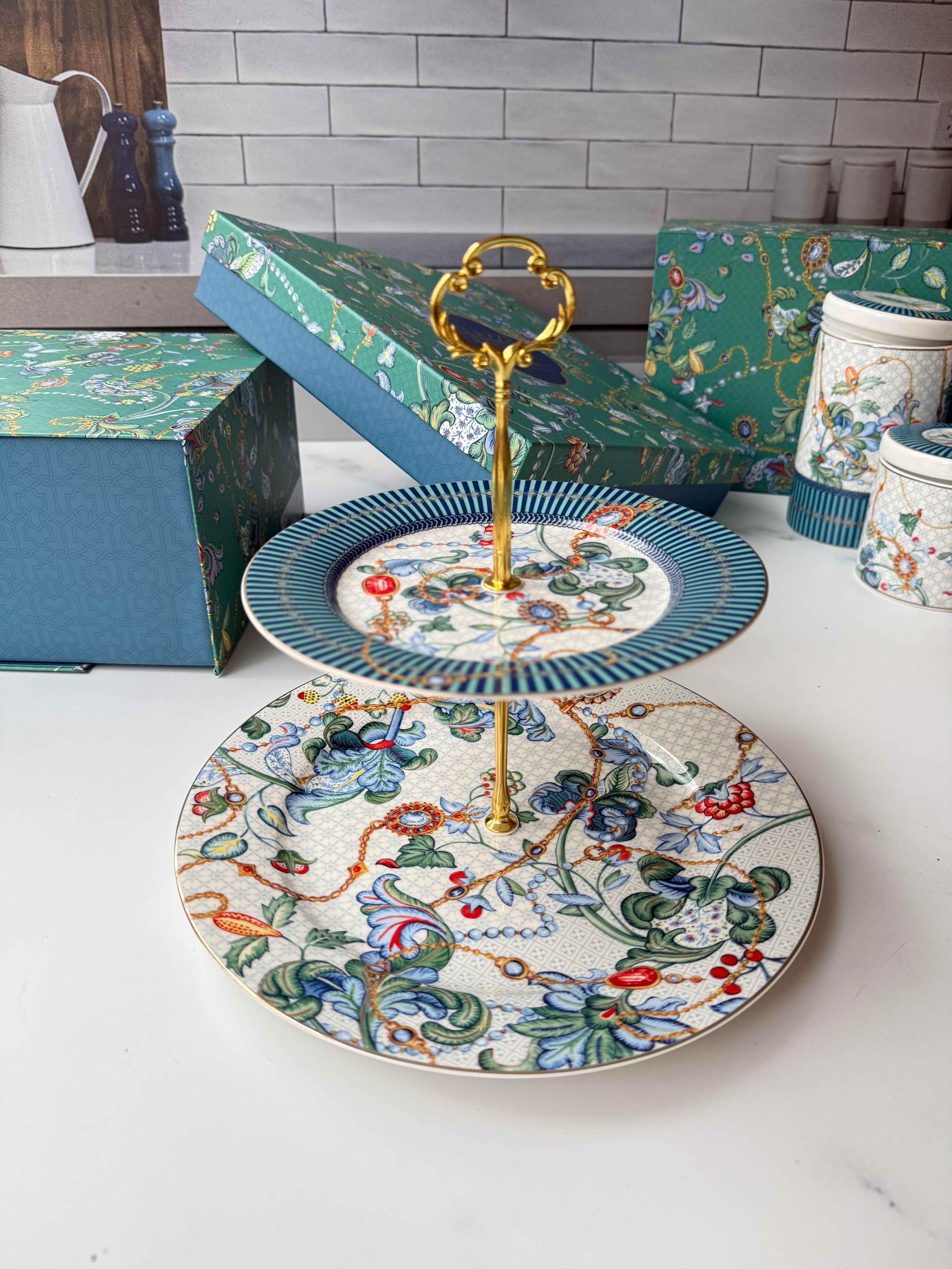İki katlı yapısı sayesinde kurabiye, kek, makaron, minik atıştırmalıklar veya meyve sunumları için hem şık hem de pratik bir kullanım sağlar.