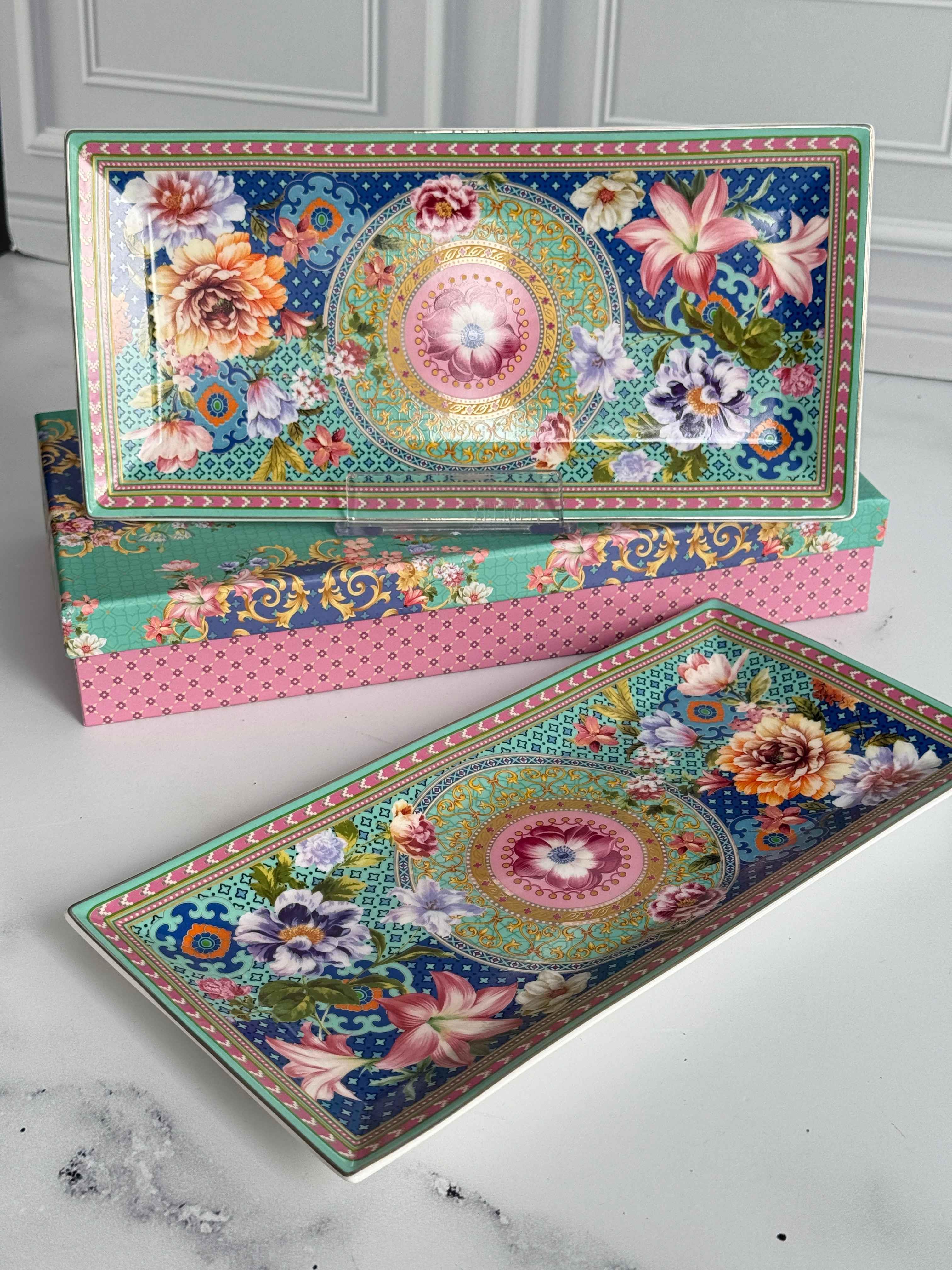 Floral Dikdörtgen Sunum Tabak 2'Li Küçük Floral serisinin zarif ve renkli dünyasını yansıtan bu 2’li dikdörtgen sunum tabağı seti, canlı çiçek desenleri ve işlevsel tasarımıyla sofralarınıza estetik bir dokunuş katıyor.