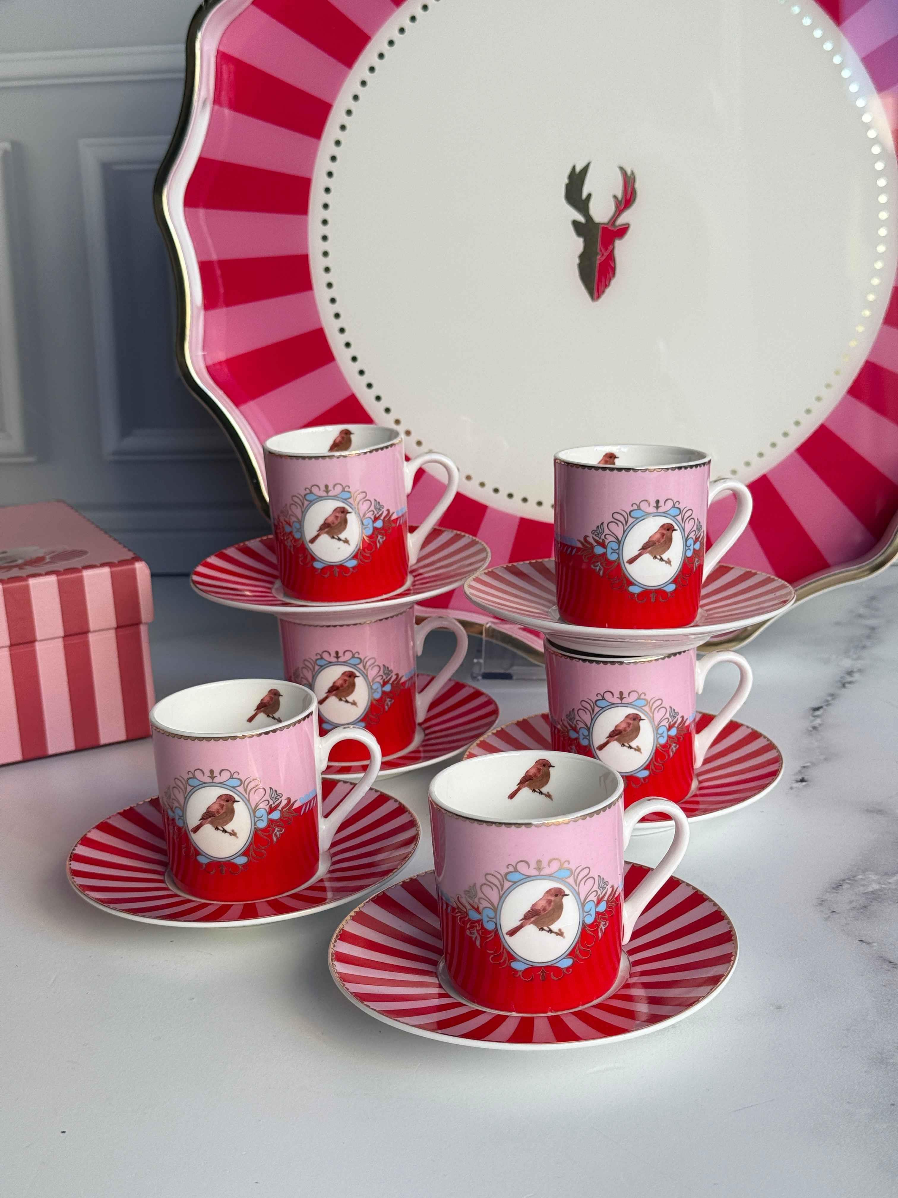 Türk Kahve Fincanı Bird Red&Pink 6 Kişilik 12 Parça